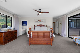 The master bedroom is a private retreat featuring a stylish ensuite, a standing shower, and a walk in wardrobe, offering both luxury and practicality in a peaceful lakeside setting.